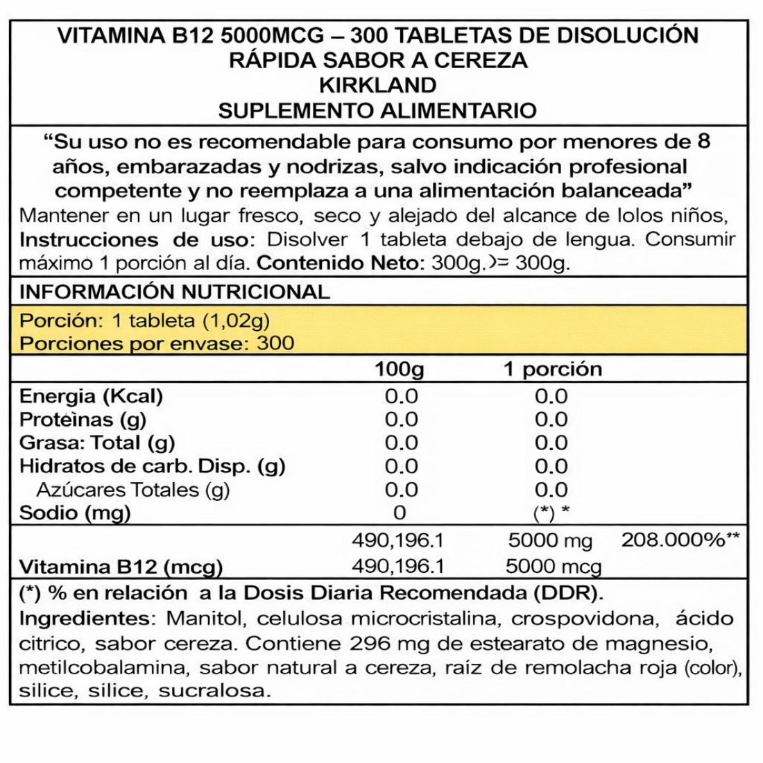 Vitamina B12 5000 mcg sublingual Kirkland (300 tabletas)