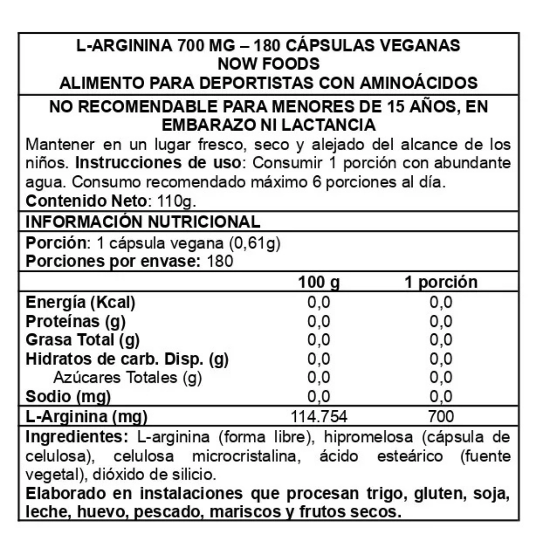 La fórmula se centra en L-arginina en cápsula vegetal y excipientes habituales del formato cápsula. Para revisar detalles oficiales del fabricante, puedes ver la ficha del producto en NOW Foods: